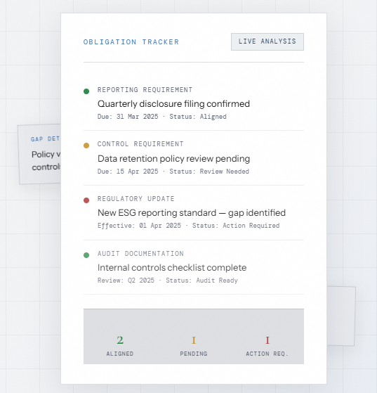 Manually reviewing, cross-checking, and tracking obligations across these documents is time-consuming and increases the risk of oversight. When regulations evolve, the pressure to stay aligned becomes even greater.