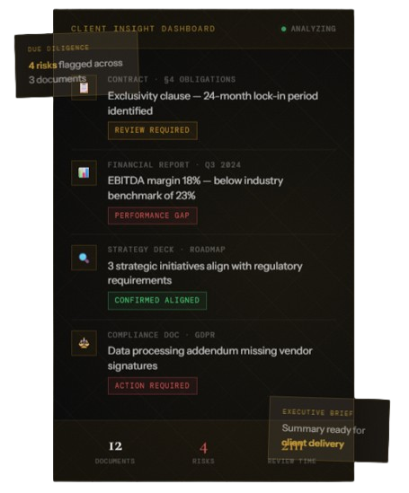 Precision tools designed for the demands of consulting — from client briefings and due diligence to M&A documentation and regulatory advisory.